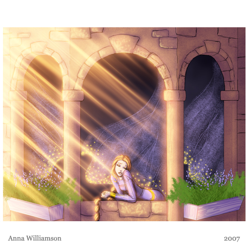 The fairy tale princess in Mother Gothel’s tower. An old sketch, done on the computer with the mouse, if that excuses the quality. It was mostly a color palette and lighting test, lots of lavender/lilac in ode to the rampion (‘rapunzel’) plant’s flowers, and terra cotta for the Italian version of the tale, Petrosinella (1634), the predecessor of Rapunzel (1812).