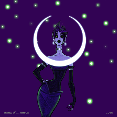 I couldn’t think of anything better for Hallowe’en than the fairy tale princess’s archenemy, the Wicked Fairy. Thought she looked Halloweenish, with the Gothic makeup, corset and claws(!). The green ‘stars’ are fireflies. This sketch was done to test the look of her crescent-moon collar.