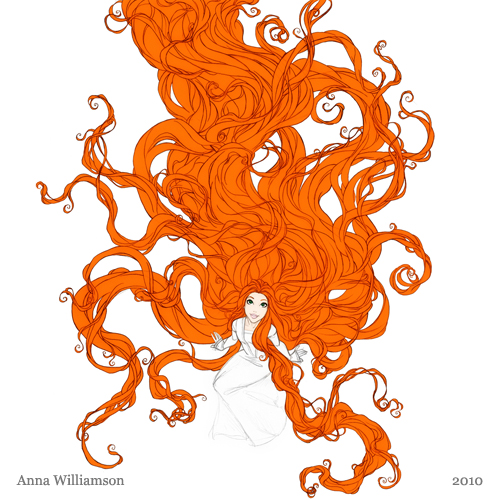 Drawing all that hair detail was so fun! (I know; I’m insane) Sometimes it’s almost like Celtic knots. It got so complicated that I scanned it so I could fill in the color to see what was hair and what was not.